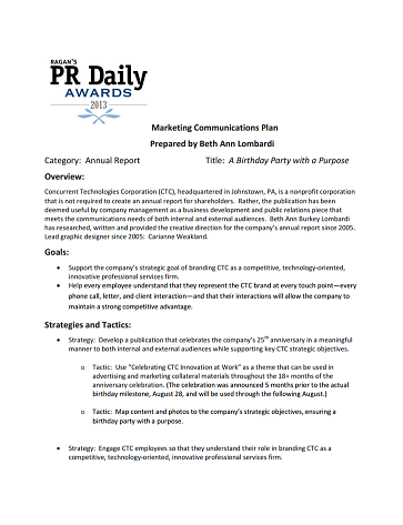 A 2016 Gold MarCom international award winner for publication excellence, this 2015 annual report tells the company’s advanced technology story in a relevant, readable manner. This is the tenth consecutive year that Beth has won a major national or international award for writing this company’s annual report. Read More